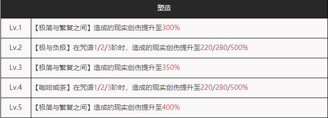 X的塑造提升全部加的伤害倍率,六星也就算了,五星的塑造属于是有些敷衍玩家了,虽然说不拆分机制,但是都是五星辅助了,在塑造上整点花样也不是不可以,又威胁不到上位六星的选择(暂时也没有上位六星)。不建议任何人为了X的塑造去抽一个不想抽的池子(真爱党除外)。