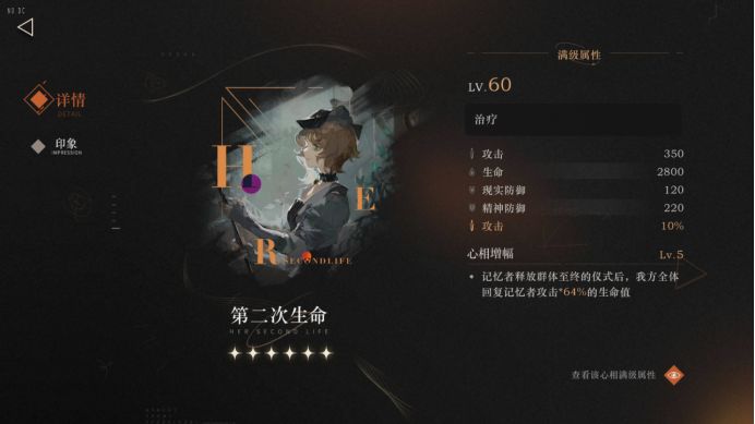 作为一名智属性的五星现实创伤辅助角色,由于是五星,且是辅助角色,面板差距有什么实际意义了。因此五星便不与同定位角色比较面板了。