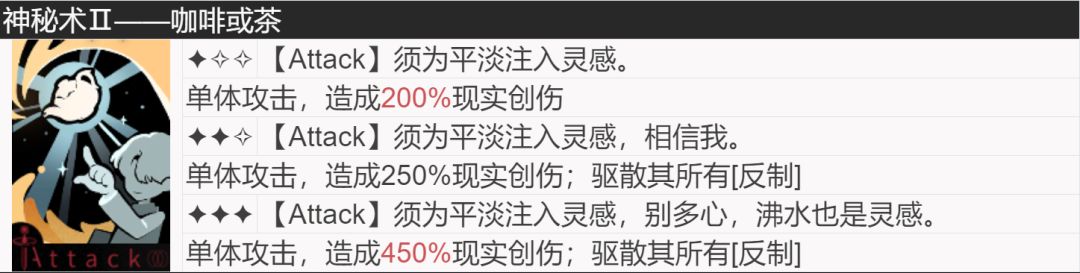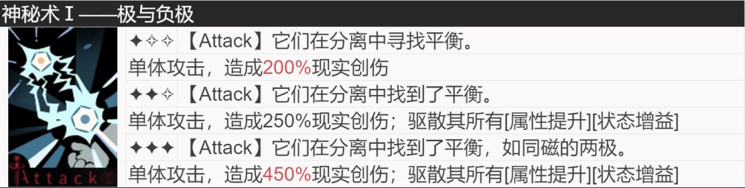 X的神秘术I单体攻击时是标准的倍率,二星卡以后则由A卡(卡面底端是ATTACK)变为了D卡(卡面底端是DEBUFF)。因此,X的神秘术I在二星以后便不会受到[缴械]的影响正常出卡,但是会受到[缄默]的影响(所有A卡合D卡的角色都具有该特质)。