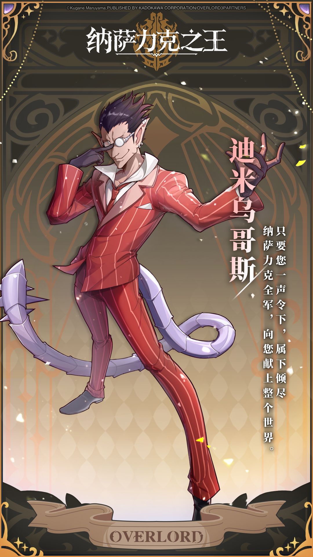 今天给大家介绍的是OVERLORD正版授权手游《纳萨力克之王》将会出现的角色——迪米乌哥斯, 还有其他大家熟悉的在动画中出现过的角色也会在游戏中出现噢!大家敬请期待~