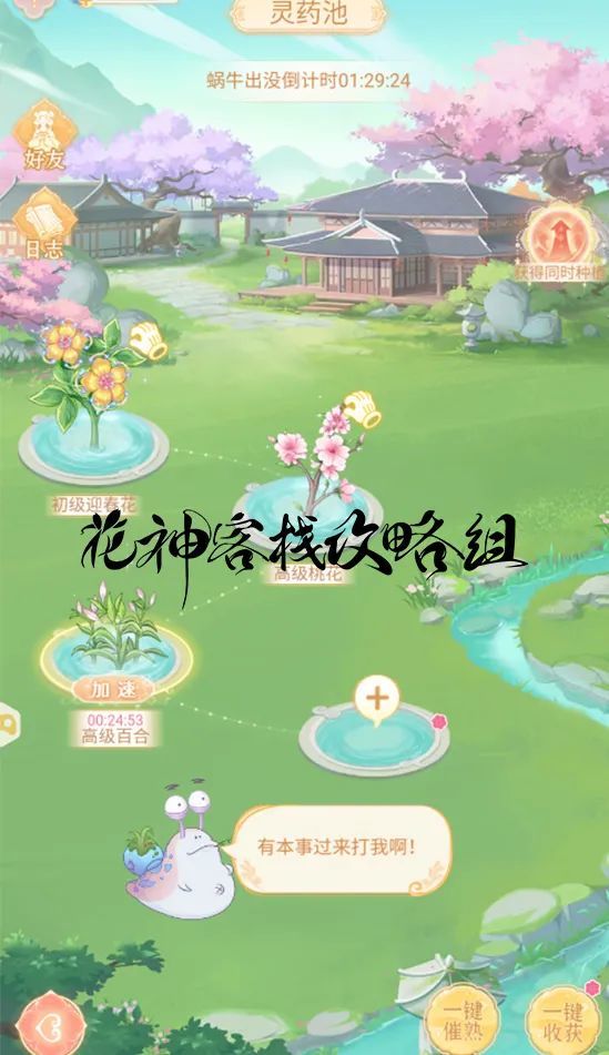 失去灵气的植物会慢慢枯萎,一定要注意“蜗牛出没倒计时”,将它抓捕归案!抓住吸收天地灵气的蜗牛不但可以保护鲜花,还可获得催熟植物的道具催熟蜜ヾ ^_^♪