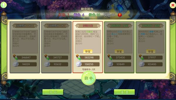 玩法:每日2次接令任务必不可少的,分为4个颜色抽取,不同的颜色所得奖励经验和银币有所差距的哦,每日免费抽取2次,再次抽取消耗元宝,点击重置恢复颜色的次数。
