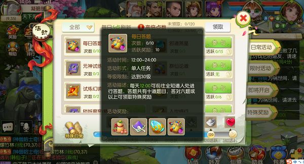 玩法:玩家达到30级且每日12点后可参与,每日最多完成10次,奖励10点活跃的单人任务。每天共有十道题目,答对六题或以上可领取特殊奖励。