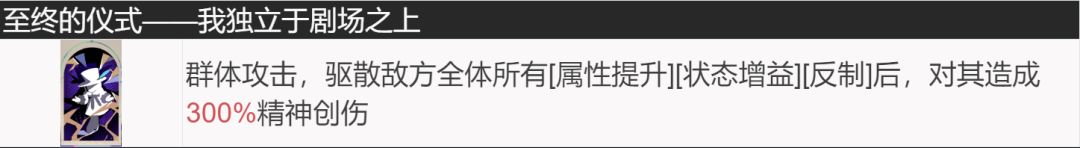 注意一点便是,夏利的至终仪式是先进行驱散再进行造成伤害。因此夏利的至终仪式可以绕过敌方的嘲讽状态作用于敌方全体(X的神秘术I的单体驱散会被嘲讽且无法驱散反制则会丧失作用),且由于能解除敌方的[属性增益]状态,夏利的至终仪式伤害可以无视敌方的减伤状态造成全额伤害。在合适的实际使用夏利的至终仪式不仅能打出爆炸的群体伤害,还能解除敌人的增益,堪称一举两得。