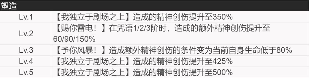正常情况下,零塑造的夏利想要吃到神秘术II的高倍率需要将血线压至50%,此时对于洞悉三之前的夏利会有暴毙的风险,而对于洞三以后的夏利,血线低于50%便会吃不到20%的伤害加成。然而塑造三直接解决了神秘术II的尴尬境地,让夏利的血线压至80%之下便能同时吃到夏利洞三被动以及神秘术II的额外加伤,且洞悉三时,夏利的神秘术I的额外倍率提升至与神秘术II相同。此时的夏利,常驻20%额外加伤,左手240%倍率的神秘术I,右手240%倍率的神秘术II,堪称实实在在的“雷电法王”。
