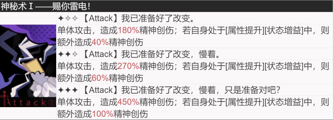夏利的神秘术I常态下是亏损20%倍率的,但是在[属性提升][状态增益]时,额外造成40%精神创伤。因此夏利在有增益的情况下会反超了基准20%的倍率,220%的倍率结合夏利的高攻击面板奠定了夏利高输出的能力。