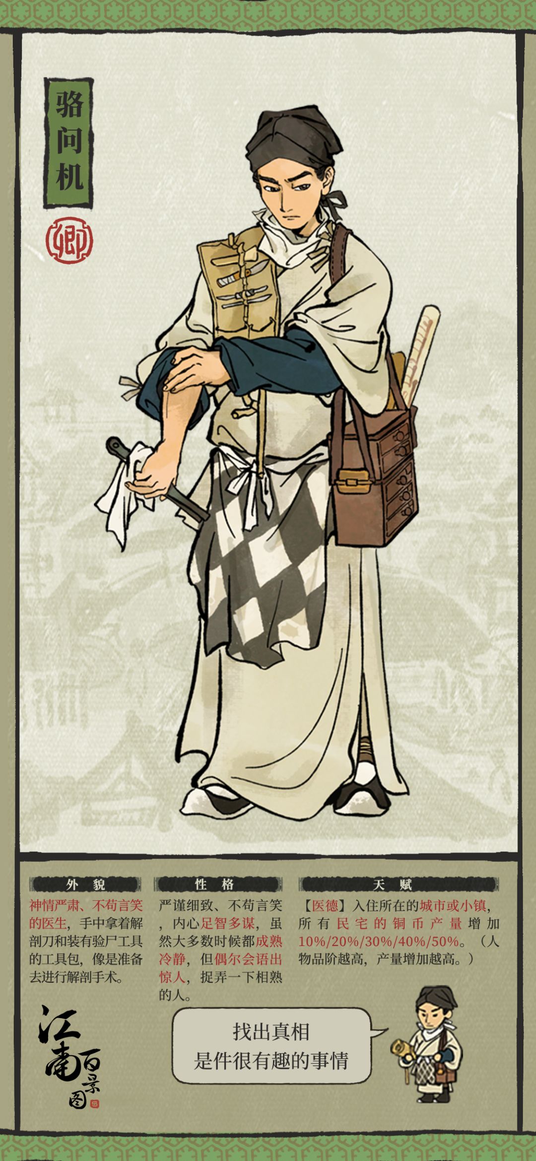 与他冷静的外表不同,骆问机喜欢挑战。在战场上做军医之时,他对将士们的每一道伤口、每一种病痛都了如指掌,于他来说,救死扶伤就如同解决一个难题,只要抽丝剥茧明白其中的关窍,就可以手到擒来。数度救人于生死之际后,他在军中赢得了神医的称号。