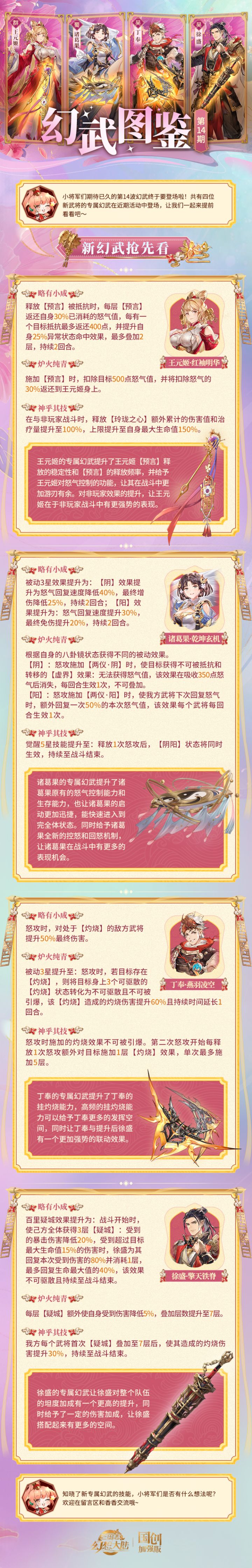 小将军们好呀!听闻一批全新专属幻武即将登场,包括武将王元姬、诸葛果、丁奉、徐盛的专武,想必大家一定非常期待!因此关关特意奉上“幻武图鉴”,内有专属幻武的立绘与技能,一起来看看吧~