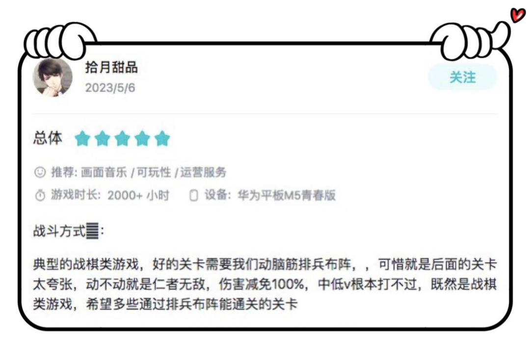 为衷心感谢活动期间在评论区用心写下真实游戏感悟的主公,我们会精心挑选出活动期间主公们发表的优质评论并在TapTap论坛公开展示分享给更多玩家,同时献上【精选礼包】奖励。欢迎各位主公在评论区积极写下您对《战棋三国》的真实感受、心得想法亦或精彩故事分享,即可参与#精选留言回馈有奖活动#,同时您的宝贵建议将很有可能被采纳进之后的版本当中。