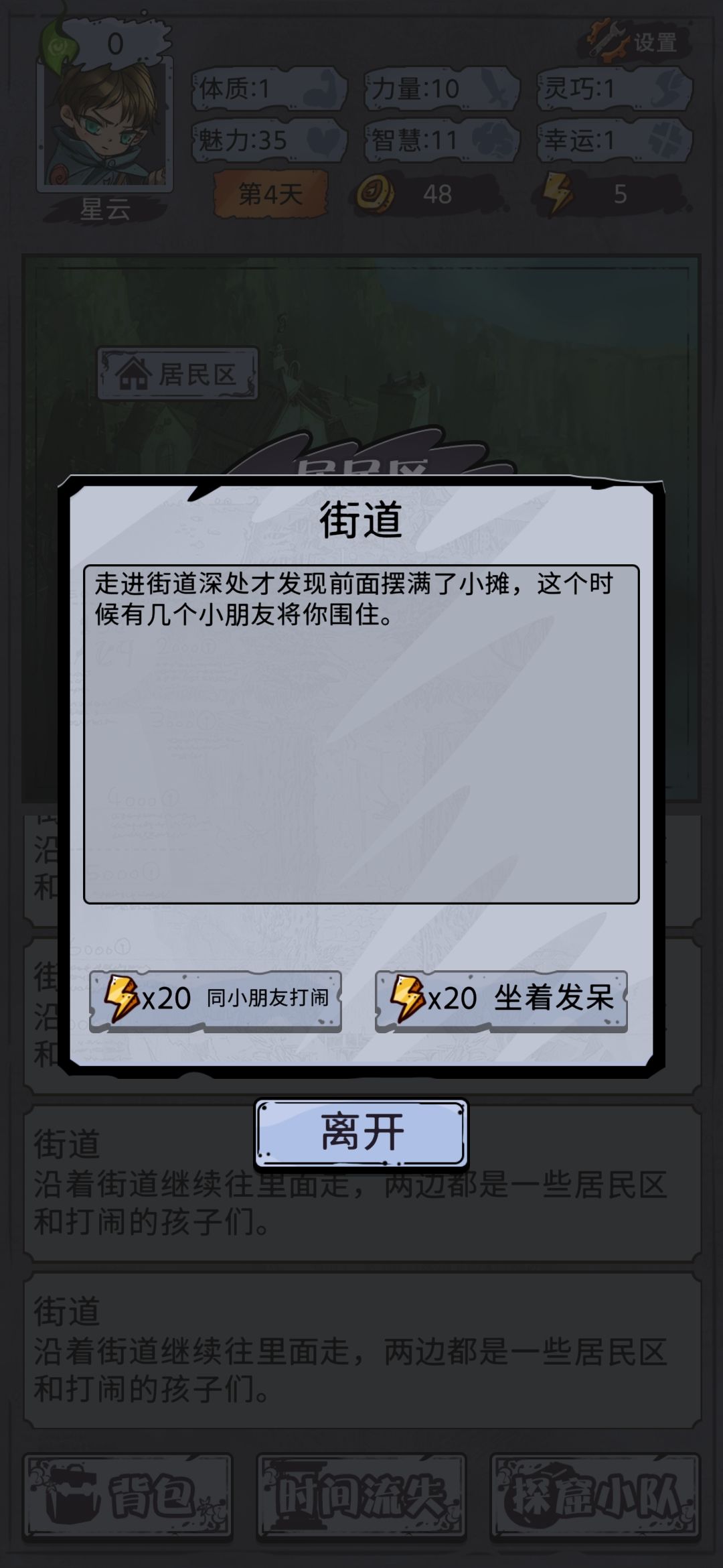 但是在街道同时还能触发的还有一个减体质的突发事件,不过在前期,尤其是还没进行回归之力加点的,反正属性不会降为0及负数以下,大胆的来刷就完了,先把魅力刷它个几十点,然后带着个前期无敌的朋友出去耍岂不美哉。
