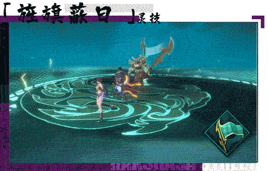 而另外一个灵技【旌旗蔽日】,则是一个大范围AOE技能,孙策将伯符旌直插入地面,激起数股电流席卷战场,造成大范围雷电伤害,并且触发一定层数的感电效果。