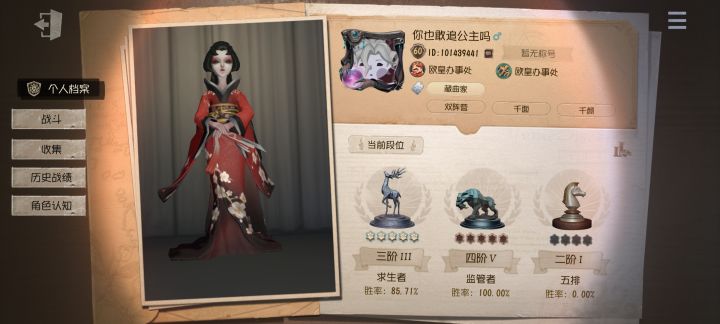 今晚上排位一把,感觉这个人巨秀所以我输得很惨烈,我就觉得他不属于我这个段位,我就打开了他的战绩和个人资料,我是单排的四阶求生38的胜率,这也是我的最高段位,但是这个人竟然是四阶百分百胜率监管,匹配机制把我匹配给他是觉得我能赢他嘛?