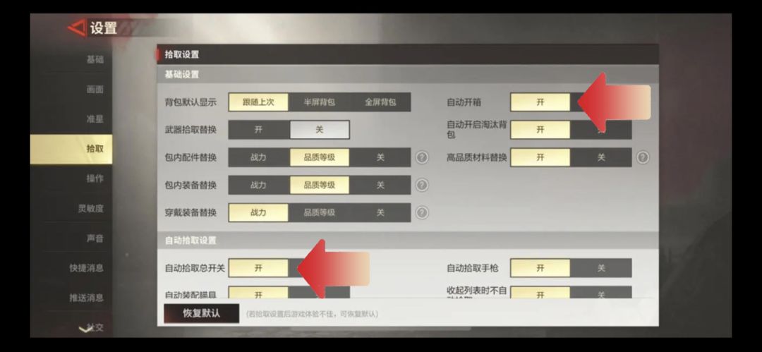 5. 画质帧数拉高,自动开箱与拾取都打开~