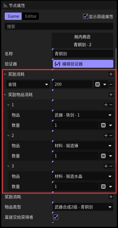 第二步,在奖励池商店处新建商店购买物品,购买后合成材料达成则合成新的道具,然后点击显示高级属性设置,从上往下为合成所需金钱和合成所需的道具,物品类型为第一步创建的物品,即达成以上条件才可以合成。