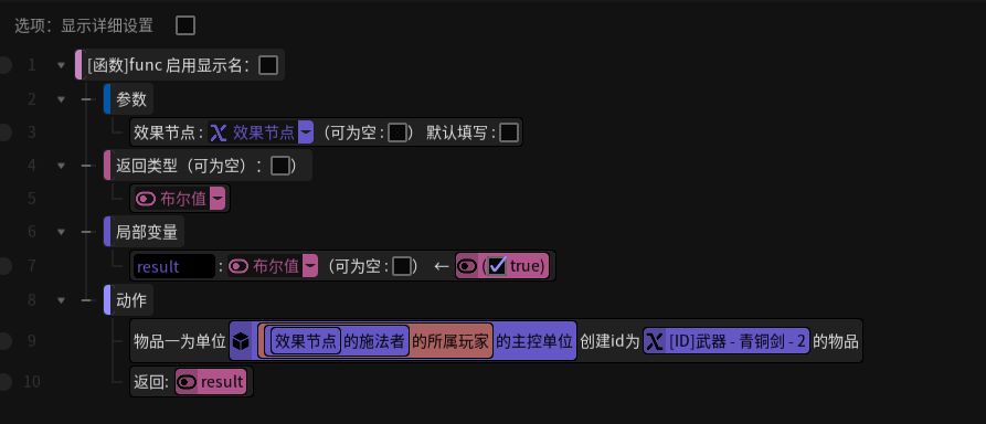 第一步:新建个物品使用(拾取生效的物品)作为物品模板,然后做个自定义效果节点,里面也就是合成后创建的物品