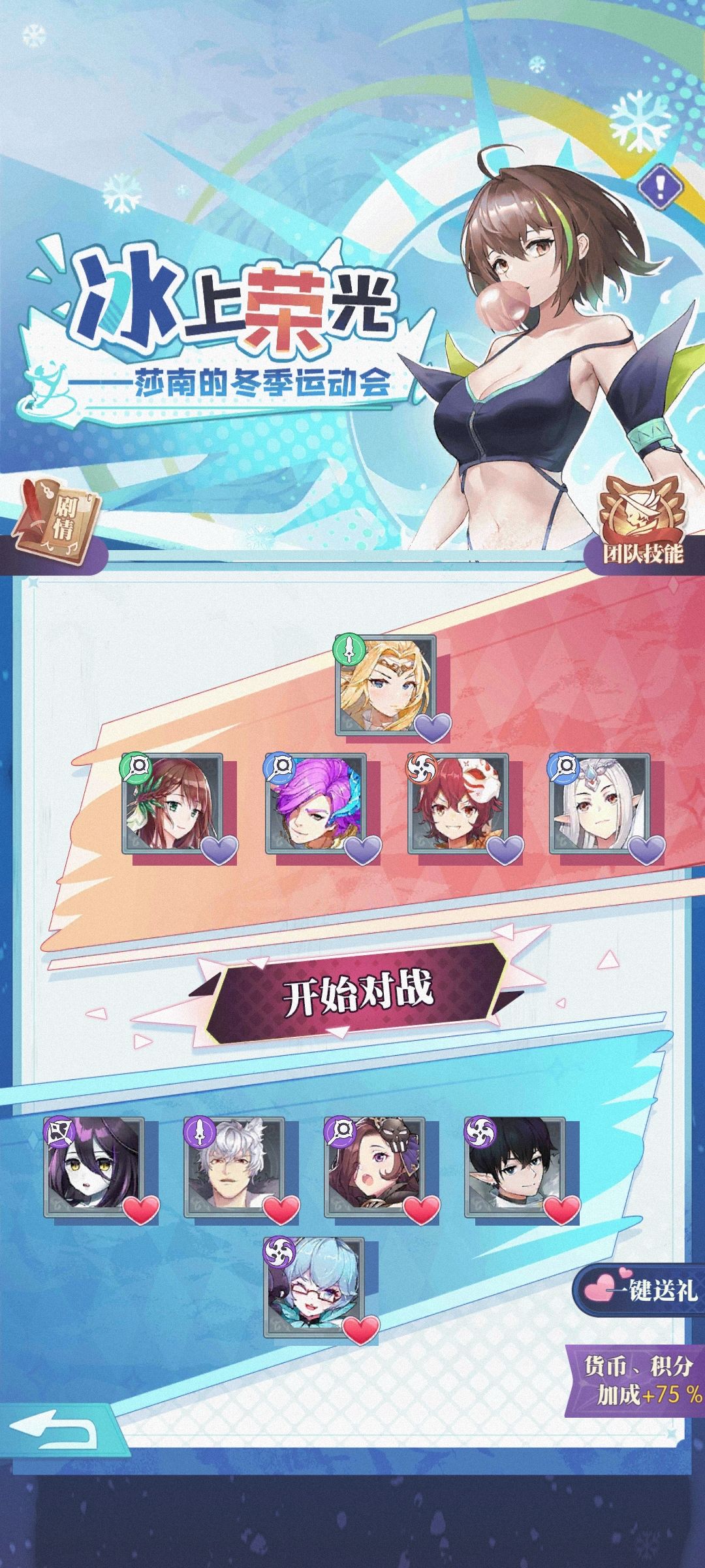 4. 通过活动任务和每日礼包可以获得「奖牌」,「奖牌」用于在礼物商店中兑换赠送英雄的礼物。出战英雄由好感度高低决定,可以通过送礼更换英雄的阵营;好感度最高的5位英雄会作为己方英雄出战,好感度为负的英雄会作为敌人出战。