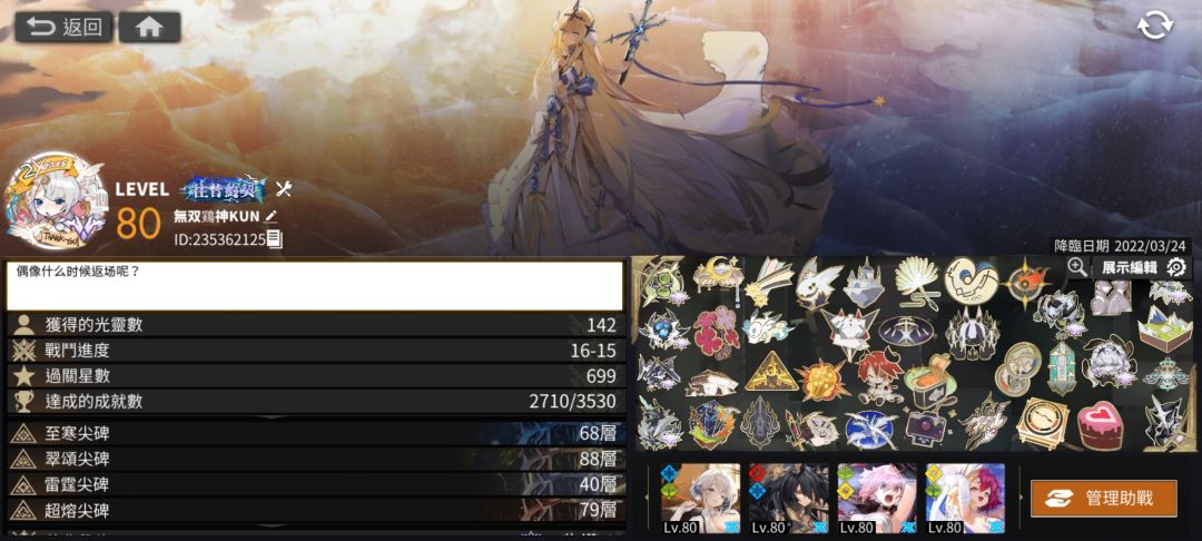 养成方面:456星角色最高觉醒三80级,3星最高觉醒二,突破材料来源主要是派遣收菜、月活动兑换、每日商店买,个人感觉前期去主线刷突破材料收益不如去刷经验本和钱本。整体下来,一个6星从1级到觉醒三80级,刚开局养成周期是三周左右,后期种草时候就很快了。突破方面,前两突不用抽重,可以直接用抽卡送的心之石,三突(也叫一破)打后要抽重,三突和六突(二破)会强化技能,不同光灵强化不一样,但大多数一破是强化主动变先制,有些是二破变先制(说你啊卡莲)。先制是日常刷资源本和灾典凹分比较重要的。武器会在光灵觉醒二的时候开放,最高10级,需要用到势力材料和光尘和钱(都可以在资源本刷)。好感度方面,每日会送五个小礼品盲盒和两个中礼品盲盒,按阵容送有加成,升级能小幅度提高白值。总体下来,单角色养成,比较缺的是钱和突破材料。