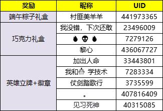 通过随机数的抽取,恭喜以下冒险者获取本次奖励,请在七个工作日内联系官方客服(QQ800181136)提供您的信息。