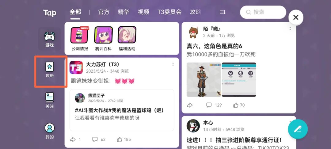 在《火力苏打》游戏移动端(安卓和iOS皆可),通过右上角“设置按钮 - TapTap动态 - 攻略”,也可以浏览TapTap攻略站。