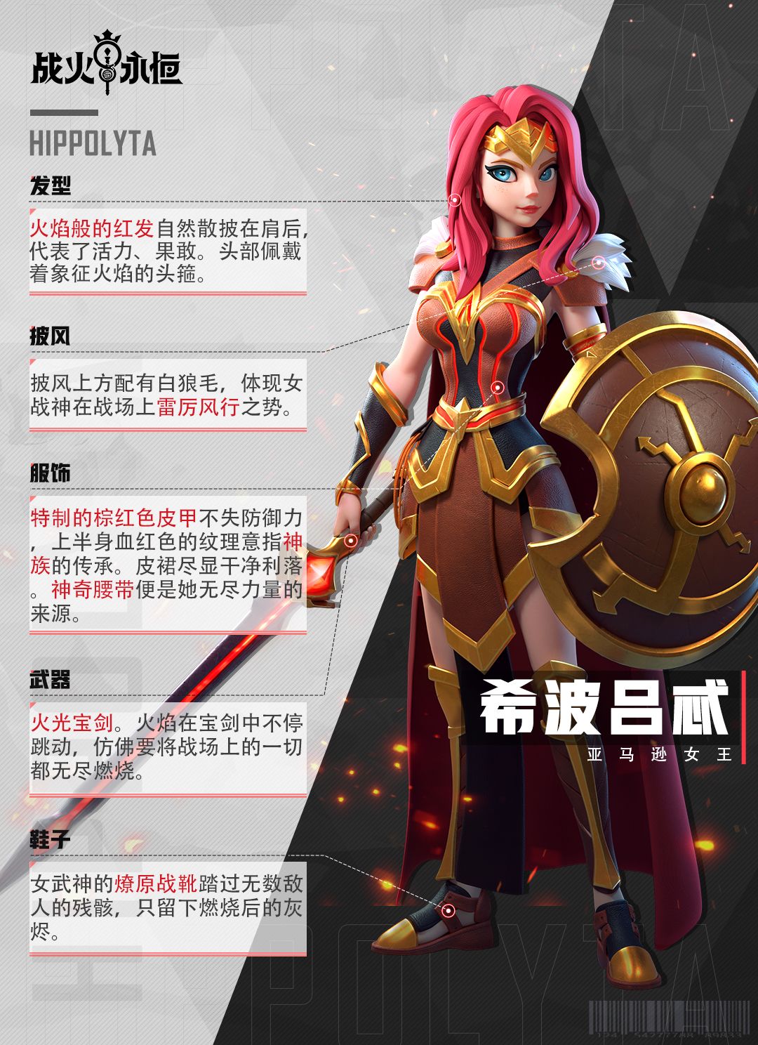 在诺伦大陆,希波吕忒是火系进攻型史诗英灵,携带的兵种为盾兵。她的主动技能【烈火侵袭】能够释放5道天火,每道天火对随机敌方队伍造成法术伤害,并使其能量减少,攻击速度降低,效果可叠加。