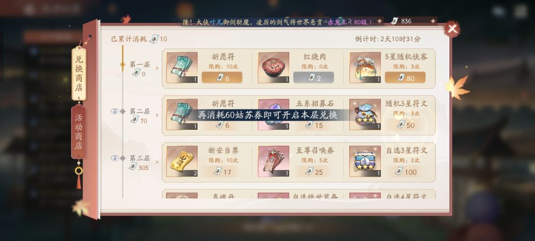 其他活动各种屯法以及注意事项 一:幸运招募活动:此活动为250抽卡卷为一轮,大家平时可以积攒点抽卡卷,如果大家这期的抽卡卷只有300多票建议大家先抽一轮也就是250票,其余的几十票及时止损继续屯着,有可能下一期的抽卡卷可以让你完成两轮。 二:姑苏夜游活动:这个活动是为了屯白票的,七天内可以获得145张白票,大家可以多攒点,白嫖玩家推荐购买五块红烧肉十张白票,里面的活动商店可以购买三次1888金龙的物品,物品为20白票和两个五系招募石,这类物品买不买在于个人意愿,如果想拿到至宝和自选魂器的玩家推荐屯满1305张白票,兑换商品分为5层,解锁第二层需要在第一层消耗60白票,解锁第三层需要在第二层消耗295张白票,解锁第四层需要在第三层消耗695白票,解锁第五层也就是至宝这层需要在第四层消耗1025白票,至宝兑换需要520票,所以最终想拿到所有价值的东西需要累计屯1545张白票。