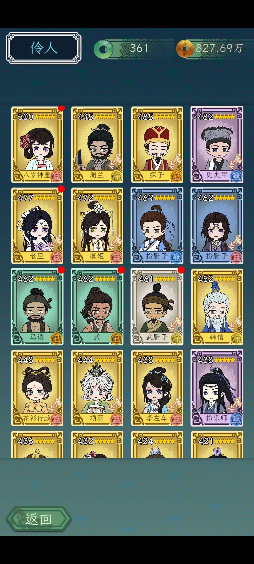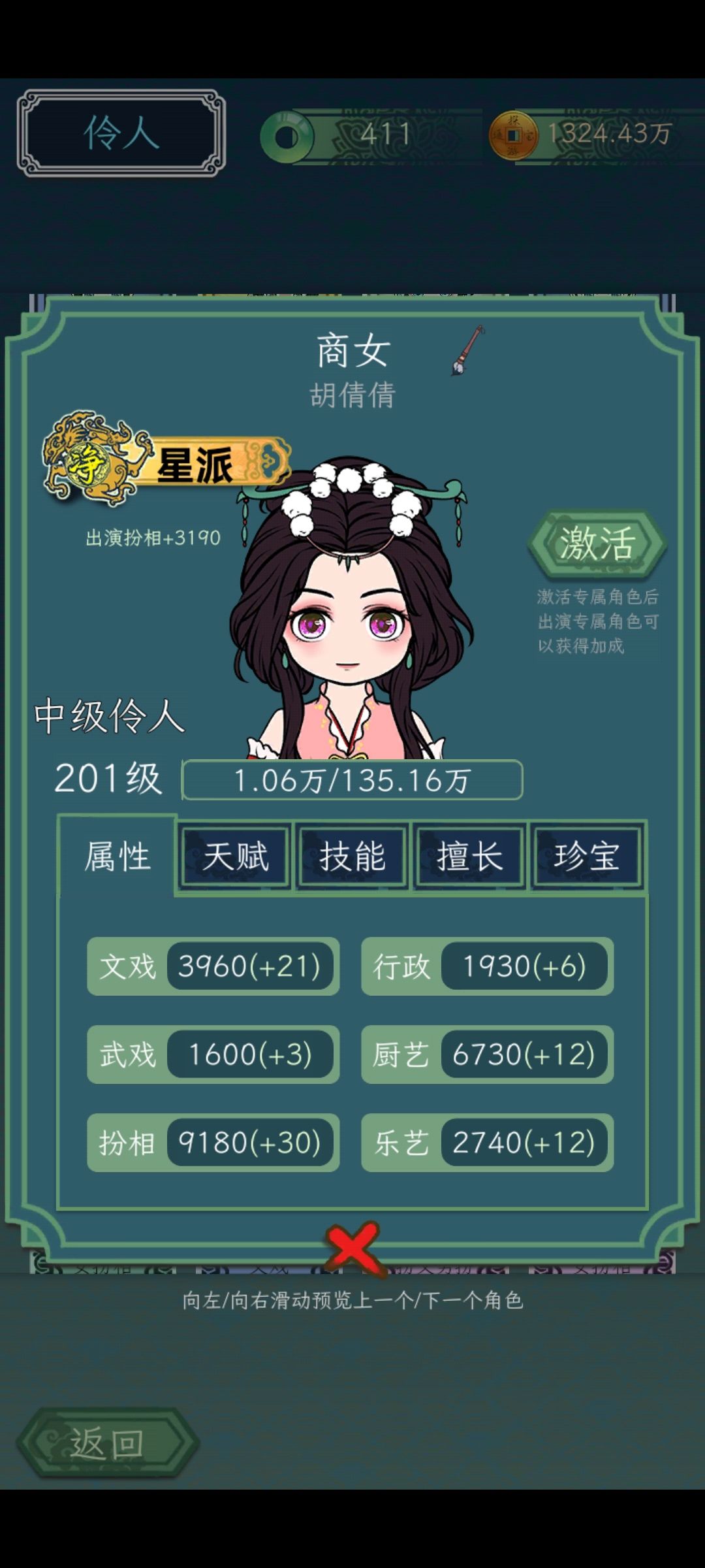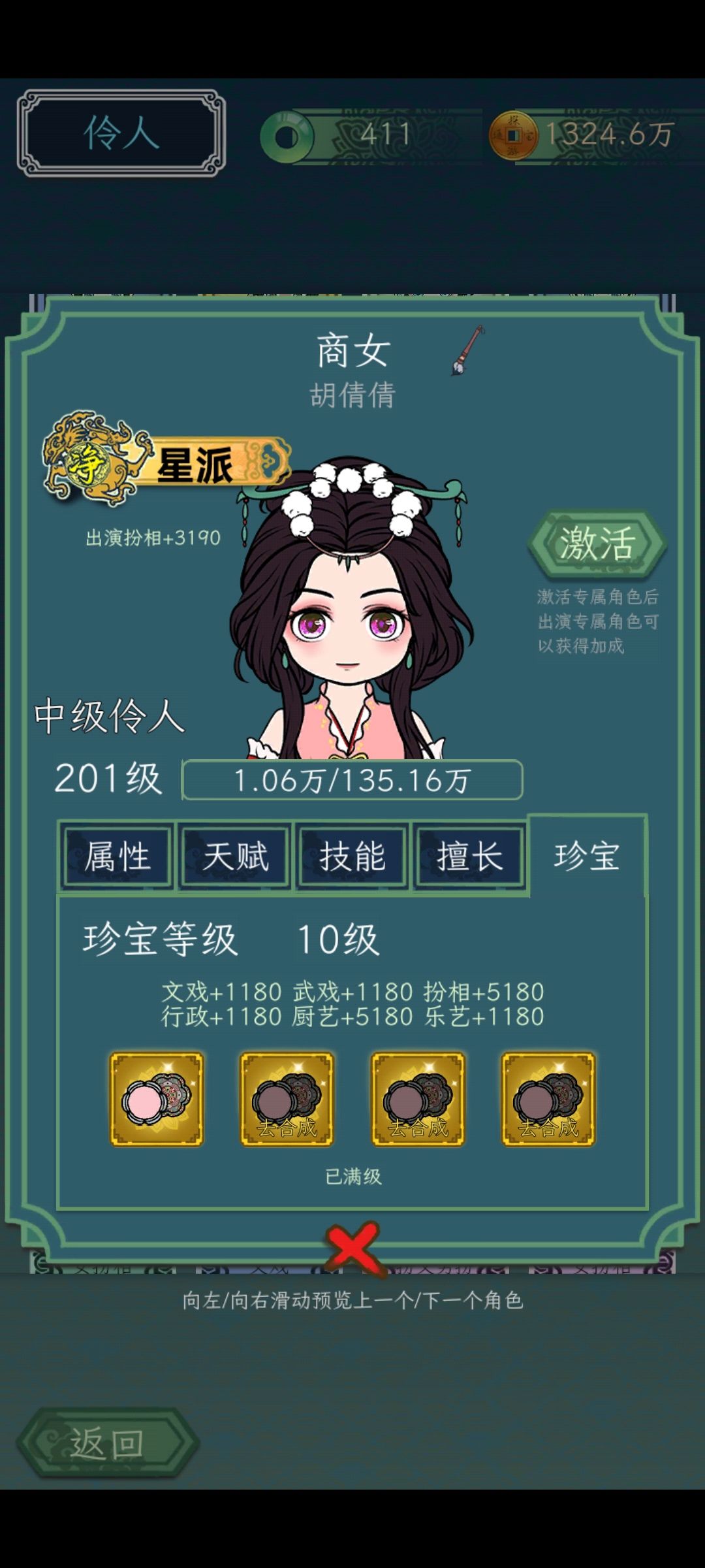 200级单属性加成珍宝就能属性近万,商女应该是后期扮相最高的角色。天赋为行政/厨艺/乐艺加成的一般单属性高珍宝也都是该属性加成的,金色以下的珍宝喂完紫养到400级就差不多够了