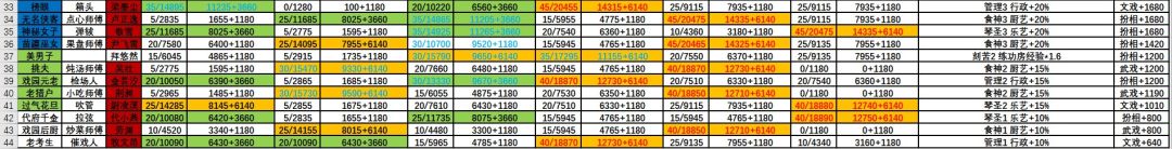 金色的和居中的都是值得培养的,加粗的是重点培养绝对不亏的,技能优先加百分比加成的,根本没必要加固定数值的,用流派就能很容易让低级角色突破300级,低品角色根本没必要突破400,停留在400级收益也最高