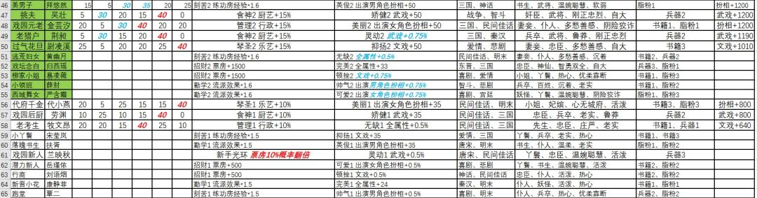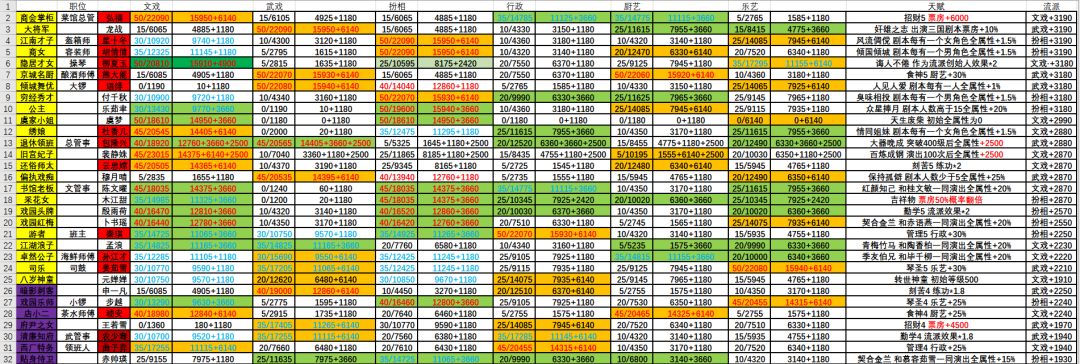 江南才子(男扮相)、倾城舞优(武)、司乐(乐艺担任司鼓吃全属性)、退休领班(文武担任总管吃全属性)、商会掌柜(文担任菜馆总管吃行政厨艺)、商女(女扮相)、还俗师太(练级快)、游者(行政)、京城名厨(厨艺)