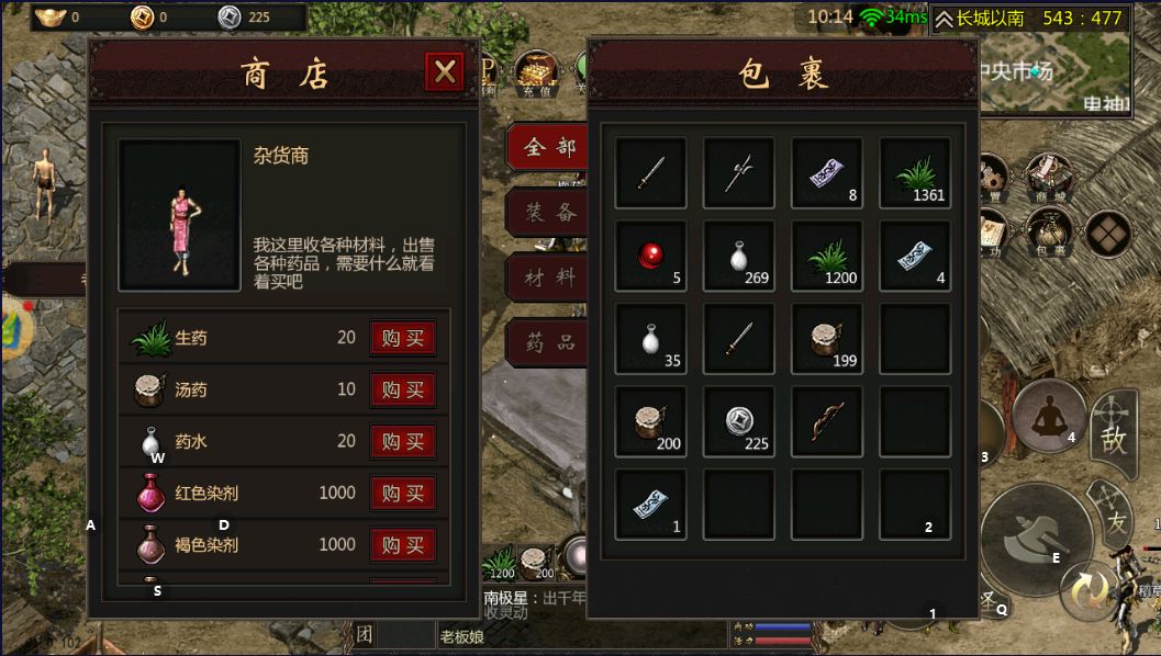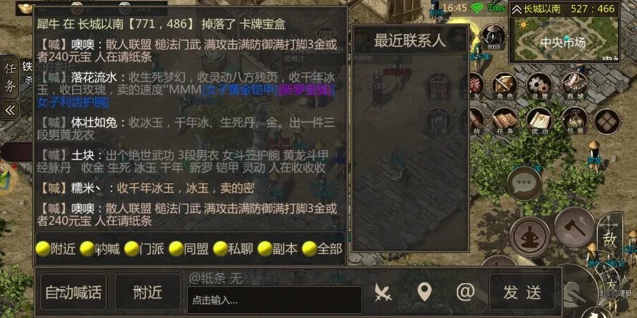 有了金元之后,就可以与玩家进行交易了。主要出金点就是材料和装备两方面,打牛、猪、马、兔之类的小怪,这种固定爆肉,皮两种可以直接去老板娘卖成铜币,还会随机掉落牛黄、骨头、马乳之类的材料,这些材料可以积攒起来公屏喊话,可以打包出给商人,或者自己在老板娘出喊话出给个人,差价有点大,自己出售的话价格你们可以商量,玩这款手游的都是一些岁数大的,都是不差钱的老板,所以不用担心出售不掉。