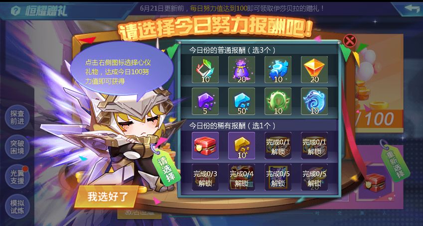 每日选择恒耀赠礼的报酬,协助伊莎贝拉的巡查工作,累积努力值达到100即可直接领取每日奖励,领取正义光辉、灼魂飞弹卡、3级古遗物宝箱、琥珀星芒等赠礼!