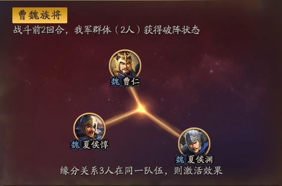 夏侯惇与夏侯渊、曹仁由于都是曹操本家兄弟,游戏里还特意设定了一个缘分关系——曹魏族将。这个缘分加成能在战斗前两回合,使两个人获得破阵效果。这一点很强大,破阵可以无视敌方防御力,造成直接的真实伤害,极大地提高己方的胜率。想必很多平民玩家,在前面几个赛季缺兵少将的时候,或多或少都组过这个队伍。走骑兵路线的话,曹仁负责吸引敌方火力,带上西凉铁骑也能增加会心伤害;夏侯渊作为主动攻击点,负责爆发输出;夏侯惇就是反制敌人,对方出手越狠死得越快。最关键的是这三个武将爆卡率高,很容易凑起。