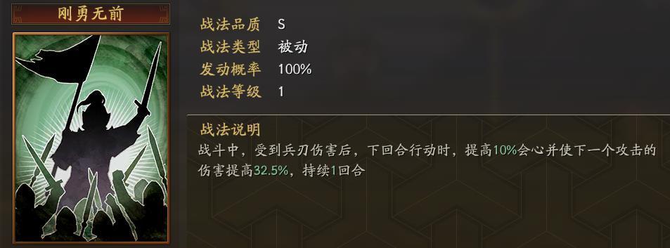 在事件战法拔矢啖睛中,用5星夏侯惇、高顺、夏侯渊和4星李典以及3星吕虔可以换取战法刚勇无前,同样是具有100%发动率的被动战法,适合用于中慢速队伍中的兵刃伤害类型武将。最高提供20%会心伤害,与西凉铁骑基本相当。最高减少对方下一次攻击伤害65%,这个很厉害,使这个战法既能增伤也能减伤。理论上张飞、孟获、董卓等兵刃输出型武将都能携带,搭配击其惰归、绝地反击、横扫千军等战法,伤害数值会让人更加心旷神怡。