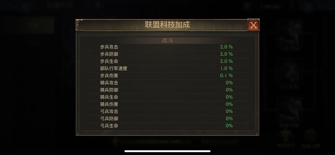 最后需要说一下战斗向的联盟科技。前期的兵贵神速、步兵攻击、步兵意志、步兵体能、步兵伤害等可以提升步兵的行军速度、攻击、防御、生命以及伤害,骑兵、弓兵、攻城兵以及部队的伤害均可以通过联盟科技得到显著的提升。联盟等级提升的越高,可以学习的联盟科技等级越高,效果越明显。