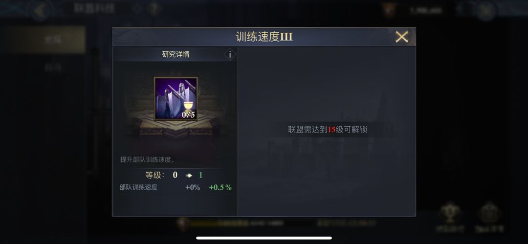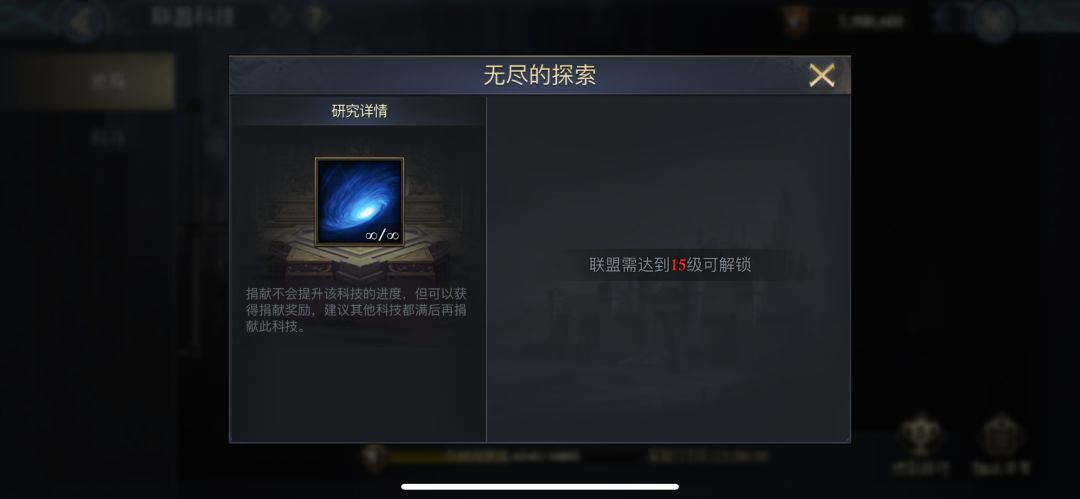还需要说一下当联盟达到15级后,研究技能逐渐提升满级,但是不用担心届时无法获得捐献奖励,但是注意这个技能不会提升科技进度,所以一定要等到其他技能都满了再去点。