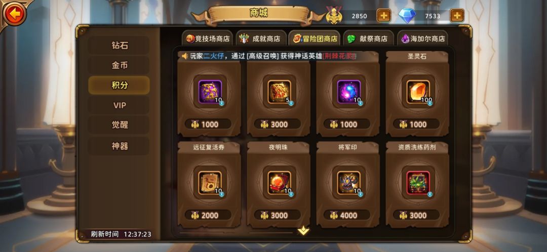 下一个冒险团的,说明一下本商店货币和冒险团升技能的货币共通,很多人迷茫我货币呐?不用想一定是升技能去了。人多的冒险团来源不愁,建议每天一个资质洗练,完成任务。