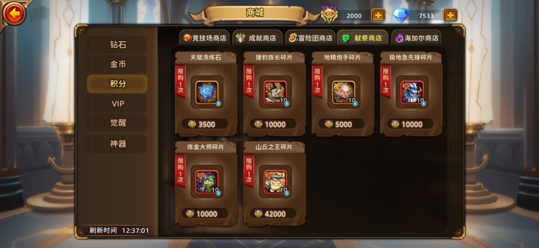 积分商店分类较多,1竞技场商店,上次的攻略说过竞技场商店有颂唱者和武僧,走深渊的不二选择。本商店碎片种类固定,没有需要的就随意花。