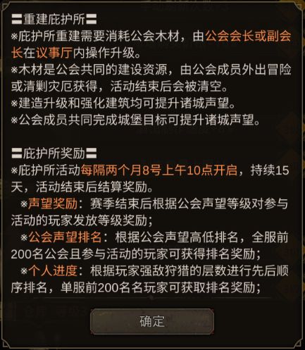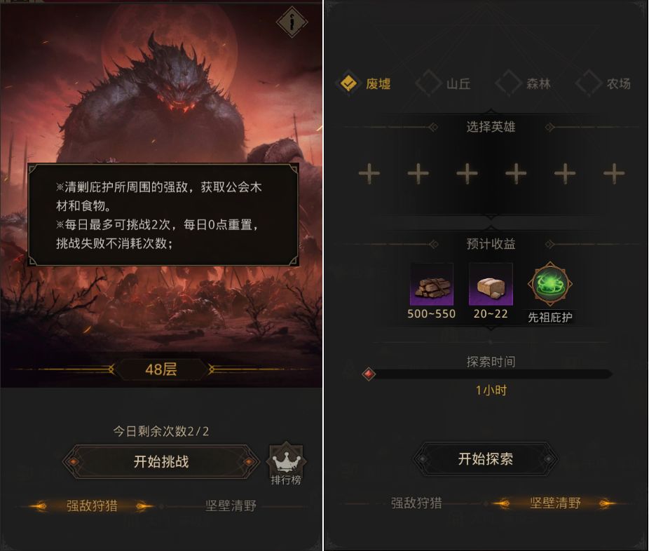以下功能均可获取木材及食物,木材为公会公用资源,食物为个人独立资源