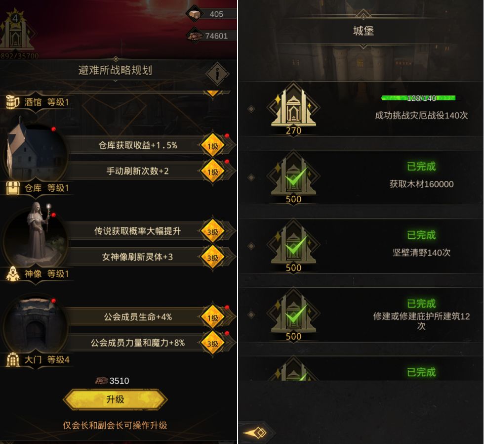 大门:升级大门提升抵御战役上限,目前最高5级可抵御150场战役,如3级大门可抵御50场战役(血月怪物海),第3/6/8天固定招魂领主,对应大泽远征1/2/3阶段