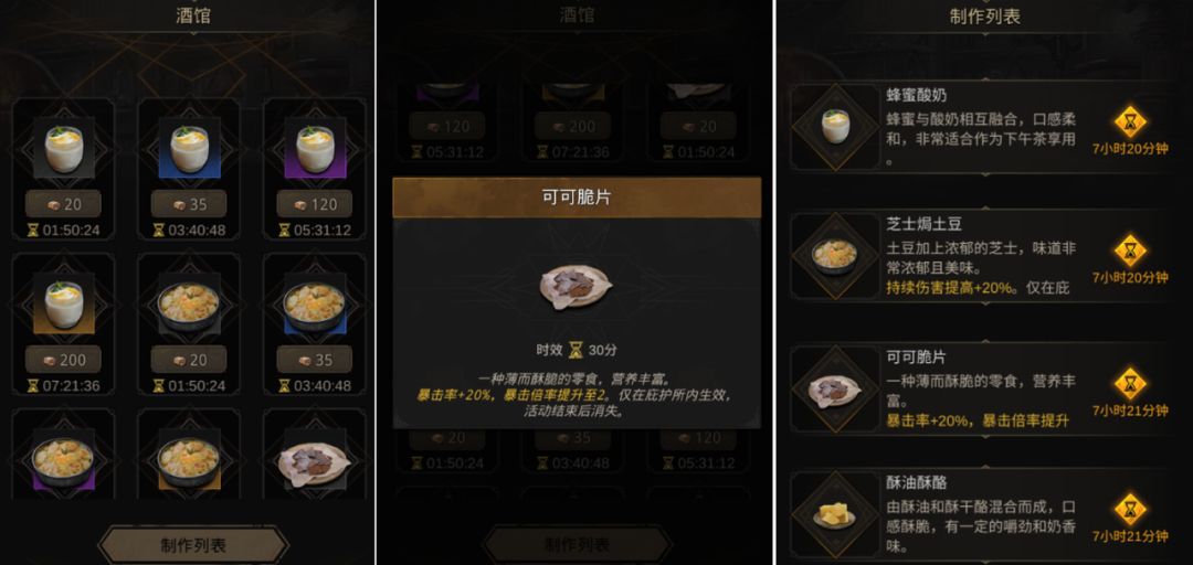 消耗食物换取buff,冒险中强敌狩猎,大门中灾厄挑战均适用,并非购买即可使用,制作需要时间