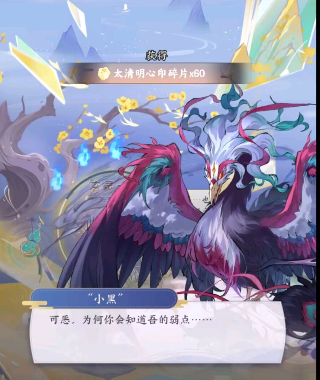 3.6 提前准备3张符纸,开始拨弄小黑,破壳成鸟,原来小黑是被封印的神兽“吾真菜”,封印后获得称号大神鸟(菜鸟级称号名副其实),以及太清明心印碎片60个。小黑破壳后出现在昊天传承和万剑冢之间。