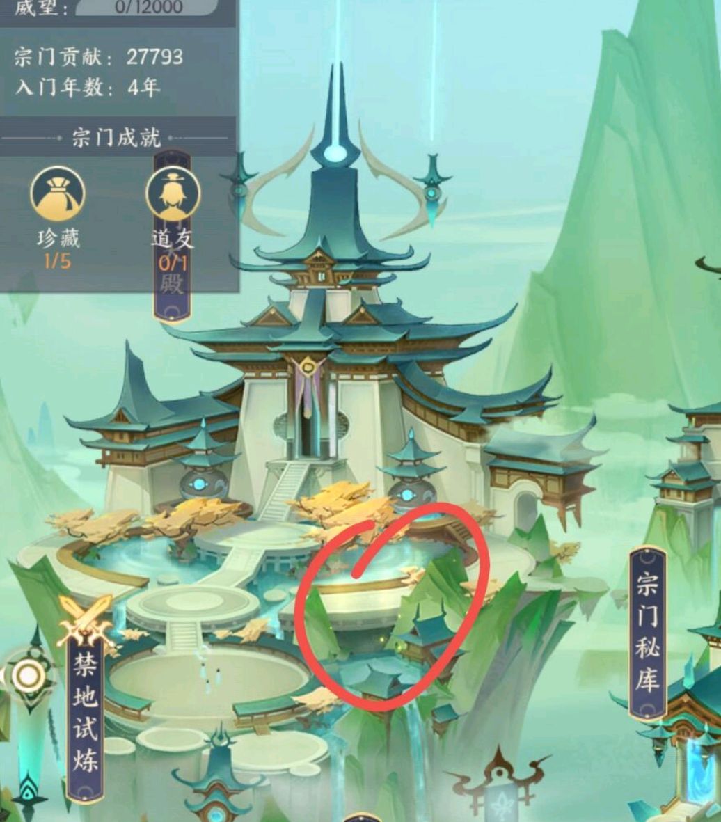 4.2 另外两片,一片在宗门宗主左侧闪闪发光的位置,一片在仙盟妖丹兑换建筑上面,点闪闪发光的就对了