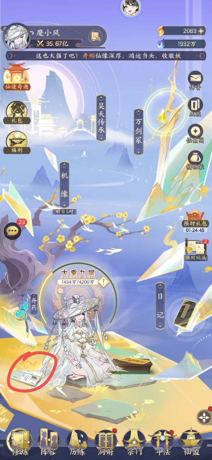 2.1主页面脚旁边有棵草,拔了给奖励,给了26万修为,草可以拔多次,不在乎修为的可以留着当个装饰品