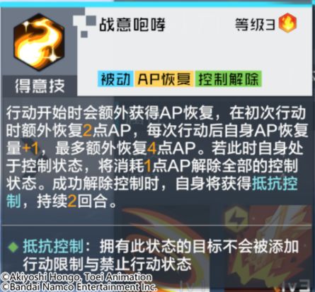 技能解析:提升自身每回合的AP恢复能力,自身每行动一次都可获得更多的AP恢复,最多每回合多恢复4点AP。自身若陷入控制状态,将在回合开始时消耗少量AP来解除控制,并获得抵抗控制的增益状态。