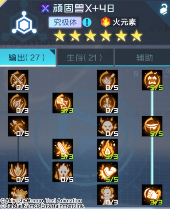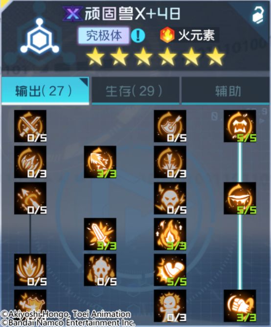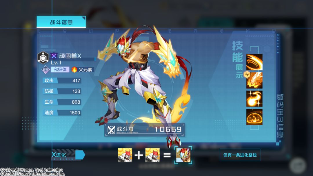 顽固兽X是火属性数码宝贝中具有特殊输出能力的数码宝贝。其奥义技是消耗所有AP对单体目标发动强力的攻击,该攻击无视目标所有的增益效果,若消耗的AP在8点及以上,此次攻击将附带压制效果,使目标无法触发被动技(第4技能)的效果;得意技提升自身每回合的AP恢复能力,自身每行动一次都可获得更多的AP恢复,最多每回合多恢复4点AP。自身若陷入控制状态,将在回合开始时消耗少量AP来解除控制,并获得抵抗控制的增益;被动提升了自身的攻击力、伤害增加与伤害减免,进入战斗时,自身将获得数层【豪气】,每层【豪气】将为自身赋予大量的韧性,自身存活时,将额外为我方全体火元素角色提供一定的伤害增加。