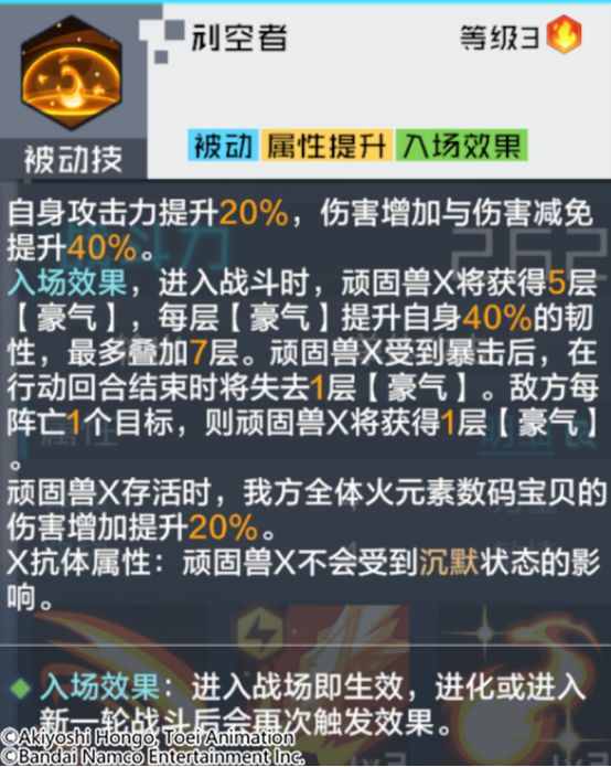 在新世纪中,顽固兽X具备独特的技能效果。通常技是攻击敌方单体造成伤害。该技能无视目标一定百分比的防御力;奥义技是至少有4点AP才能施放该技能,消耗自身全部AP,攻击敌方单体,根据已消耗AP值造成高额伤害。该攻击无视目标附带的全部增益效果。若施放技能消耗的AP达到8点,攻击前将对目标发动压制效果,使其被动技无法发动,并在攻击后额外对敌方全体发动追加攻击,造成相当于该目标最大生命值10%的真实伤害(该伤害不超过顽固兽X攻击力的一定百分比);得意技的效果是行动开始时会额外获得AP恢复,在初次行动时额外恢复1点AP,每次行动后自身AP恢复量+1,最多额外恢复4点AP。若此时自身处于控制状态,将消耗2点AP解除全部的控制状态。成功解除控制时,自身将获得抵抗控制,持续1回合;被动技可以提升自身攻击力、伤害增加与伤害减免。同时也会触发入场效果,当顽固兽X进入战斗时,将获得一定层数的【豪气】,每层【豪气】提升自身高额韧性(有叠加上限)。顽固兽X受到暴击后,在行动回合结束时将失去1层【豪气】。敌方每阵亡1个目标,则顽固兽X将获得1层【豪气】。当顽固兽X存活时,我方全体火元素数码宝贝的伤害增加获得提升!