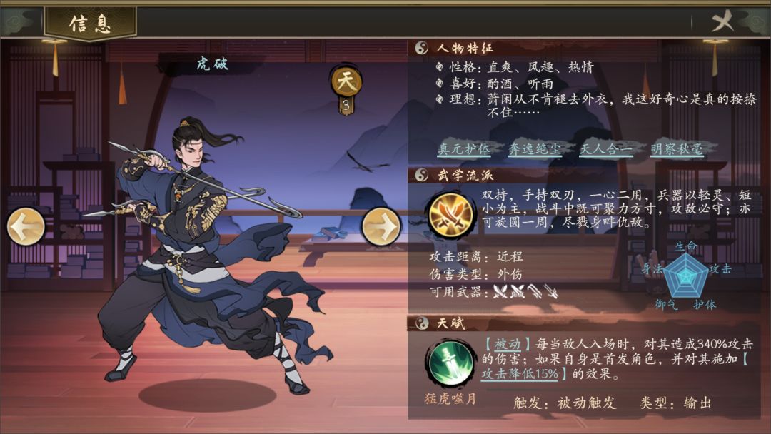 虎破作为双持流派侠客,擅长使用双剑、双刀、双钩、双刺等双持武器,修习的功法也需为双持流派功法。虎破是一个极其风趣幽默,也十分能寻找机会的侠客,能在战场中提供极好的输出效果。虽然虎破不懂诗书,谈风月不擅长,但是过往的经历让他深谙江湖中人心叵测,情商很高。相信在掌门的培养下,虎破这孩子一定能够拥有更强的寻找机会的能力。