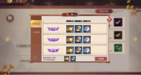 主公官职成功晋升时可获得升官奖励,官职越高晋升奖励越丰富;