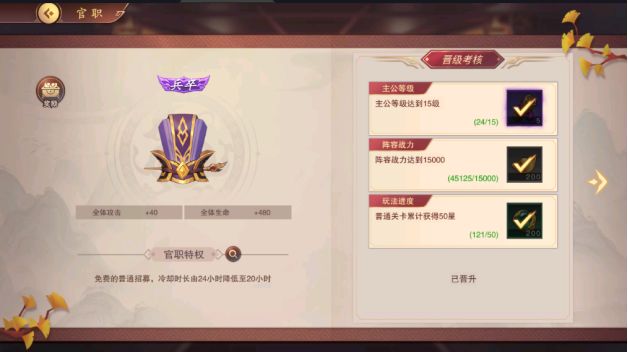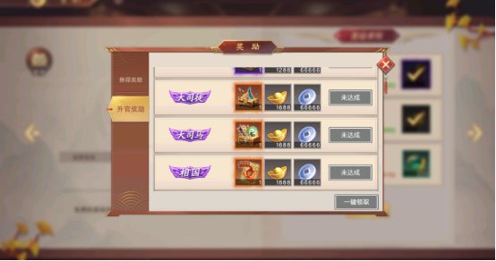 官职达到晋升考核条件可领取考核奖励,达成全部条件并消耗对应功勋数量即可顺利晋升;