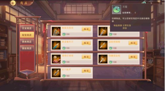 商店内新增“秘宝商店”,主公们可通过日常任务及其他活动获得兑换道具-玉璧,在商店内兑换所需的武将专武~