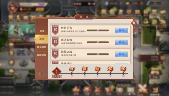 主公通过“任务”界面点击“周常”按钮即可查看当周活跃任务,完成任务达到一定活跃度后即可获得活跃宝箱~